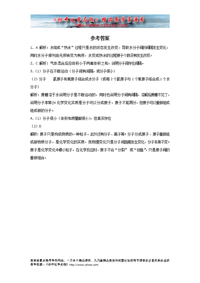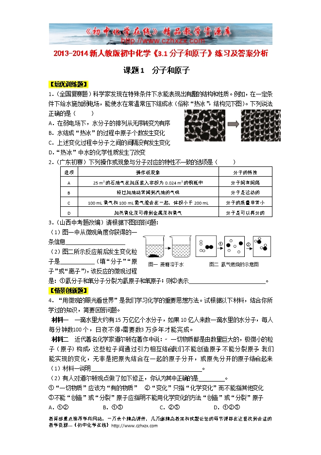 2013-2014新人教版初中化学《3.1分子和原子》练习及答案分析
