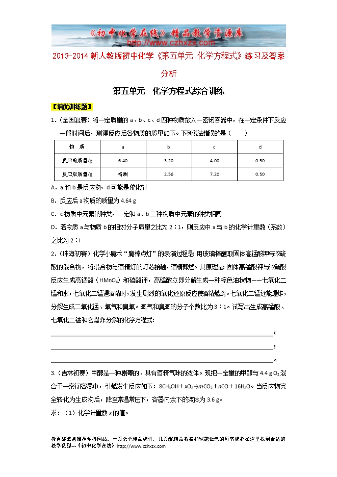 2013-2014新人教版初中化学《第五单元 化学方程式》练习及答案分析