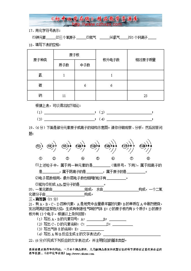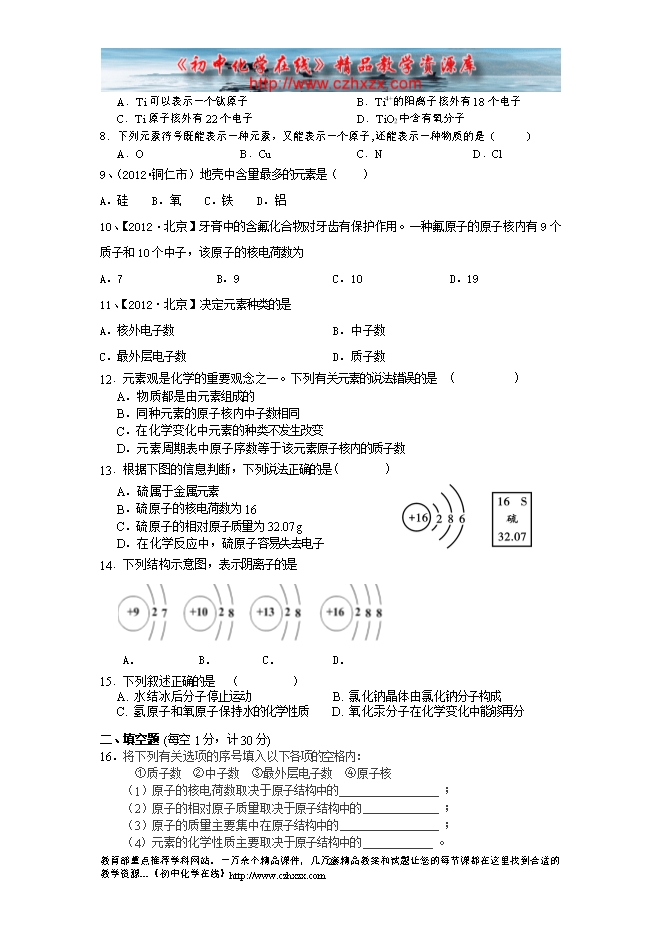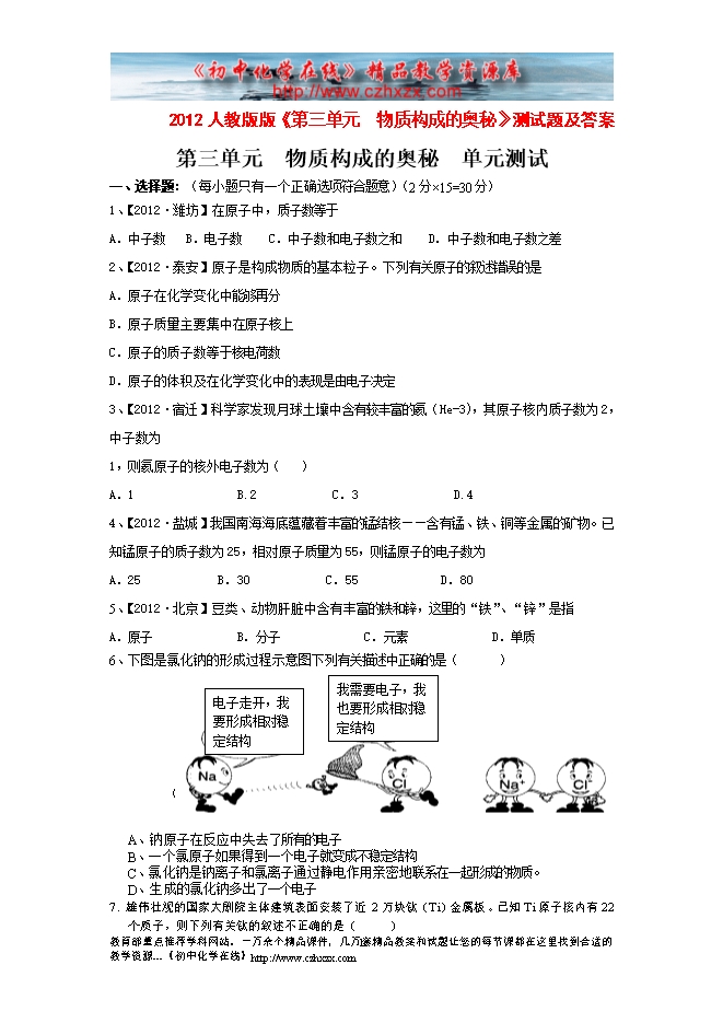 2012人教版版《第三单元 物质构成的奥秘》测试题及答案