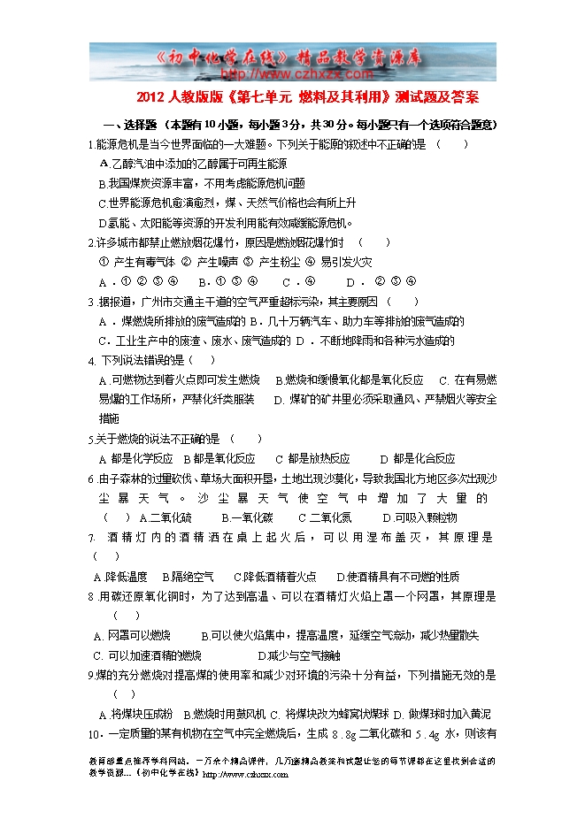 2012人教版版《第七单元 燃料及其利用》测试题及答案