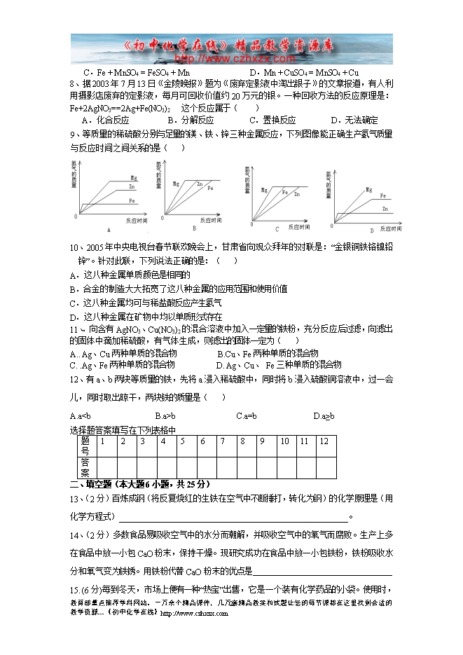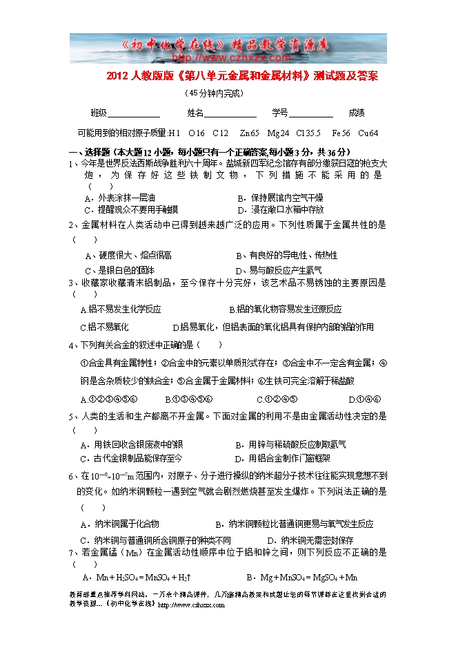 2012人教版版《第八单元 金属和金属材料》测试题及答案
