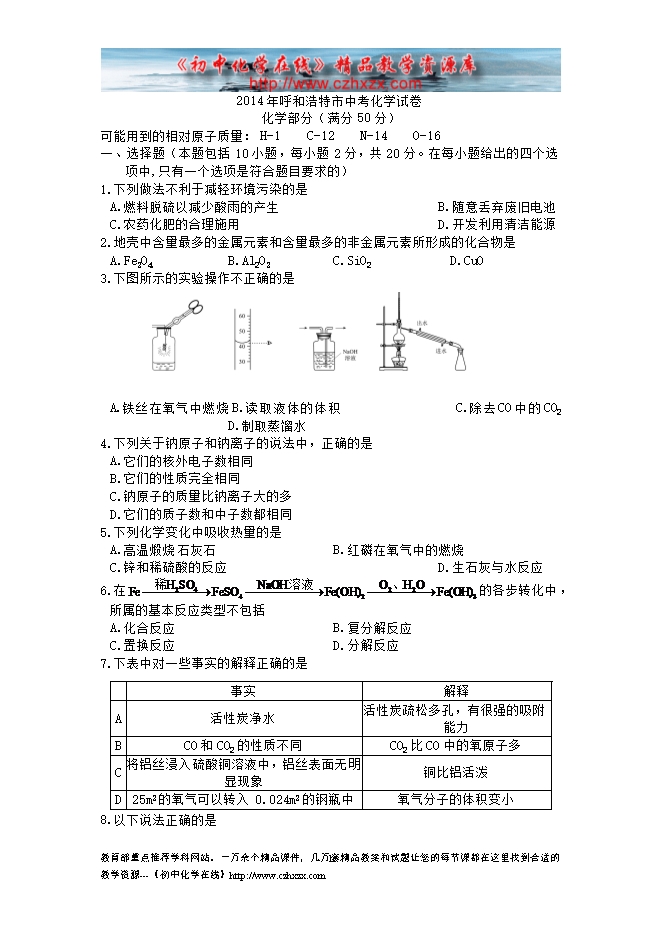2014年内蒙古呼和浩特市中考化学试题(word)