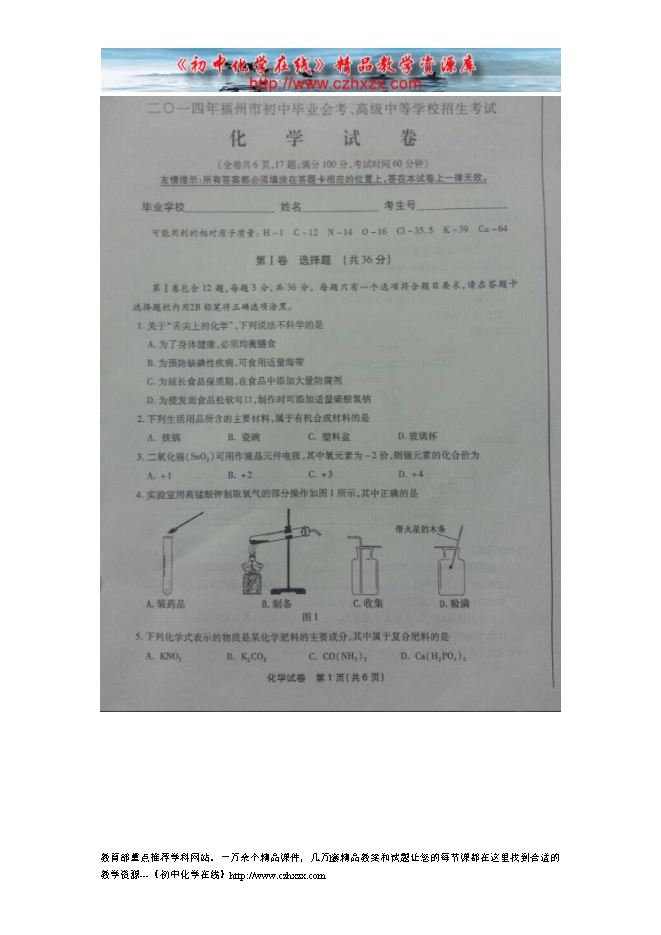 2014年福建省福州市中考化学试题及答案(扫描版)