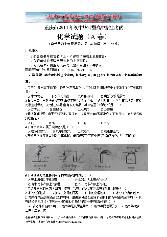 2014年重庆市中考化学试题及答案A版(word版)