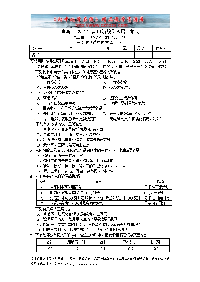 2014年四川省宜宾市中考化学试题及答案(word版)