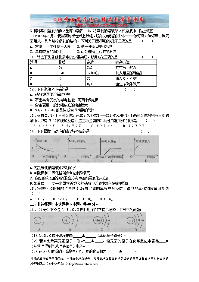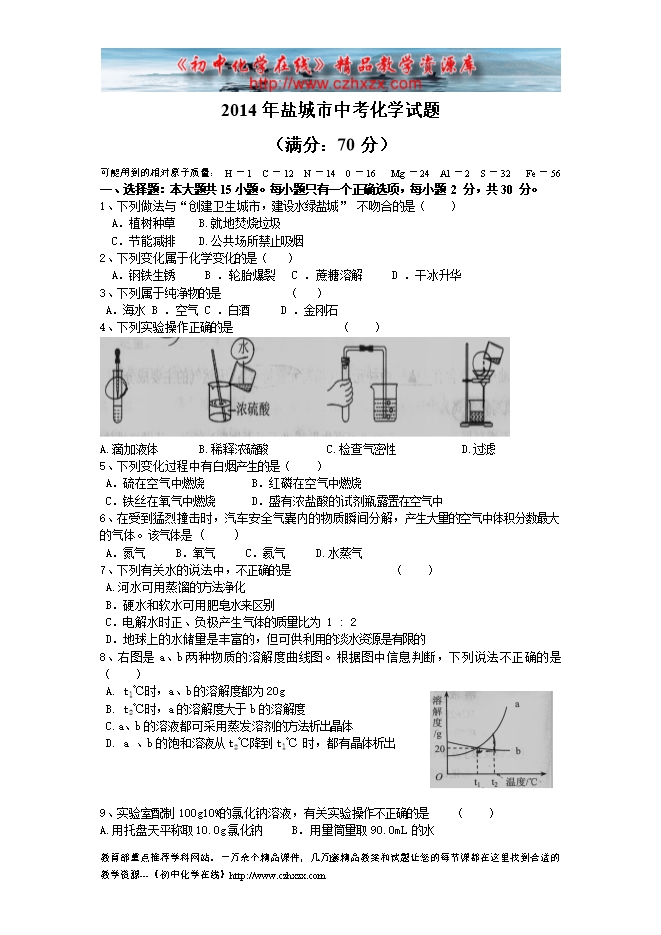 2014年江苏省盐城市中考化学试题及答案(word版)