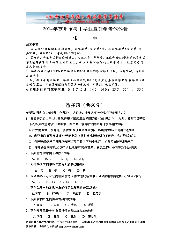 2014年江苏省苏州市中考化学试题及答案(word版)