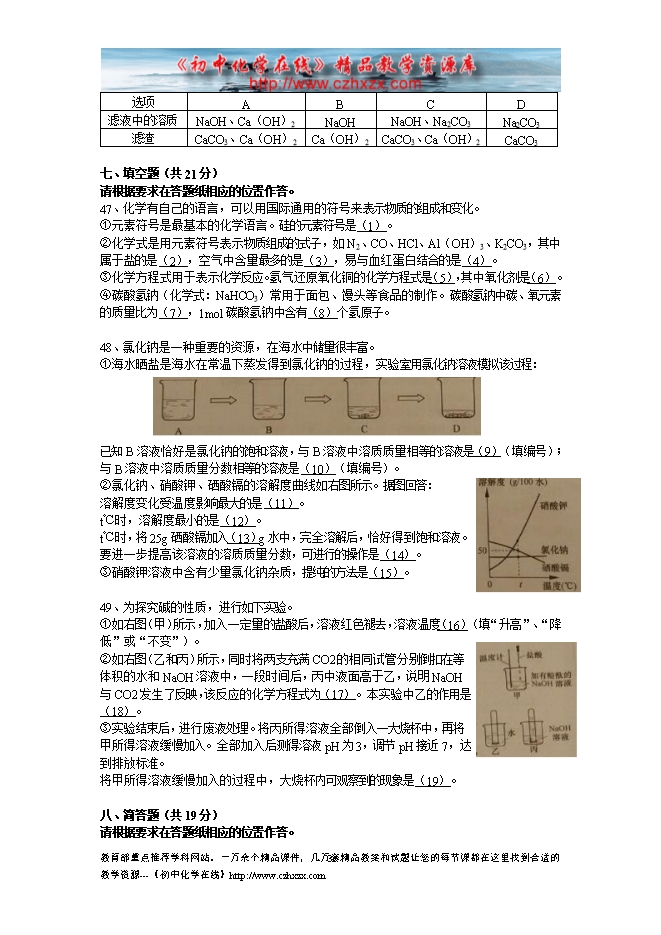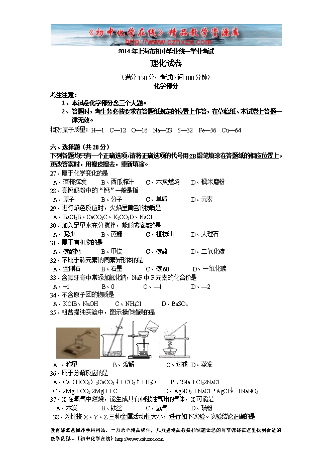 2014年上海市中考化学试题及答案(word版)