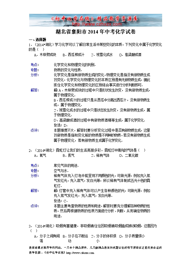 2014年湖北省襄阳市中考理综(化学部分)试题(word版,含解析)