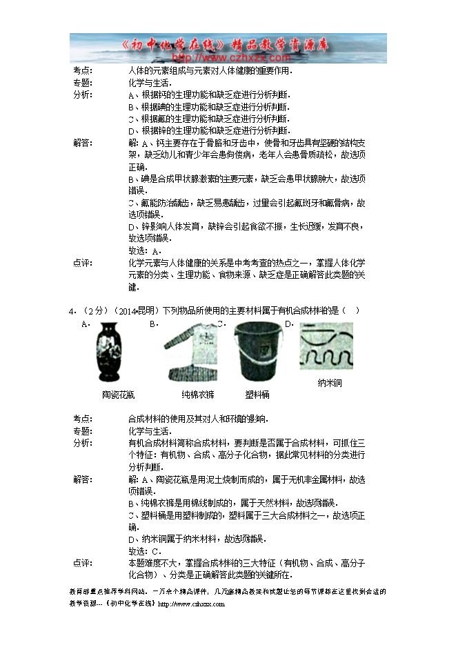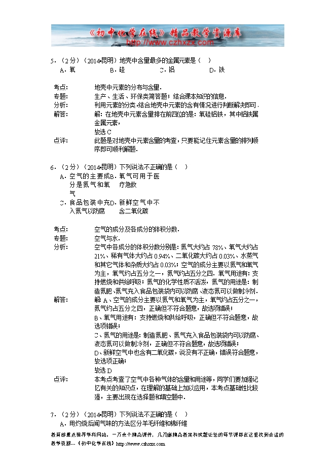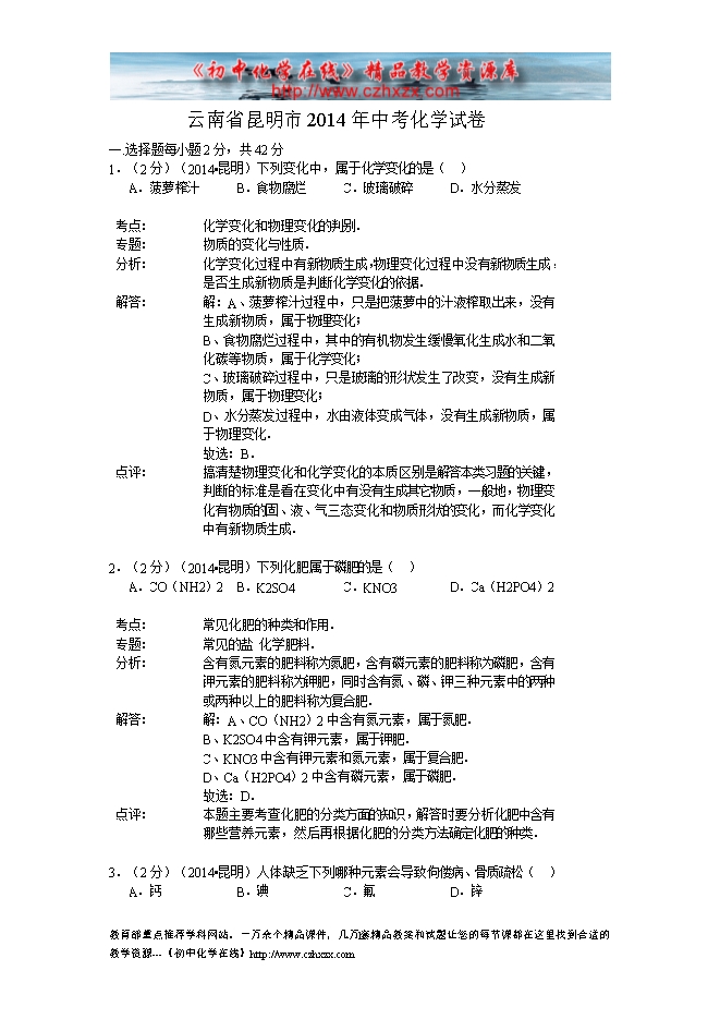 2014年云南省昆明市中考化学试题及答案(word版,有答案解析)