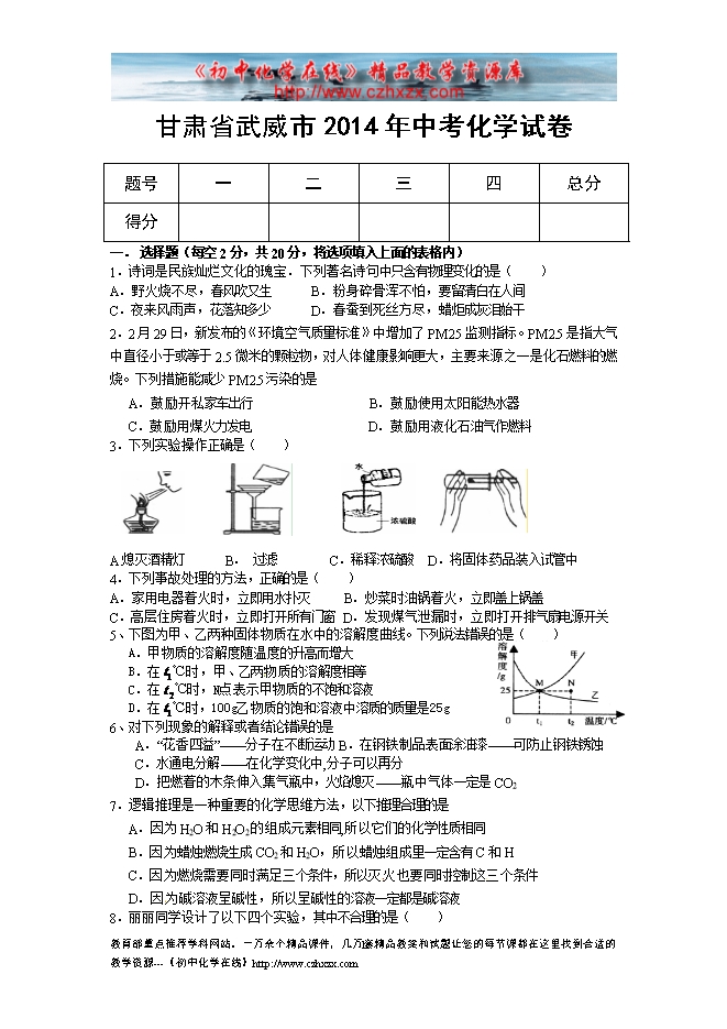 2014年甘肃省武威市中考化学试题(word版)