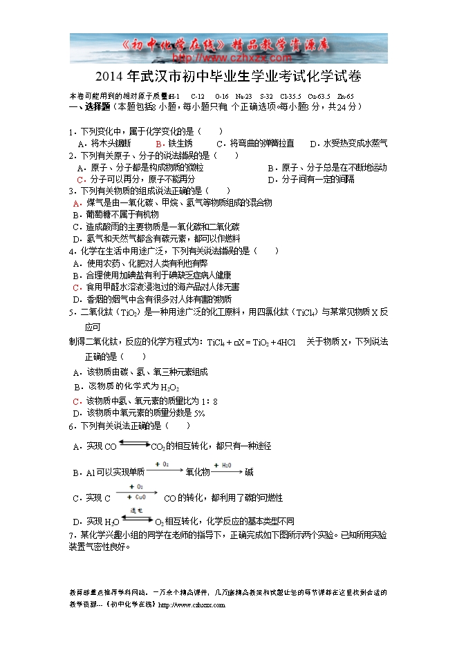 2014年湖北省武汉市中考化学试题及答案(word版)