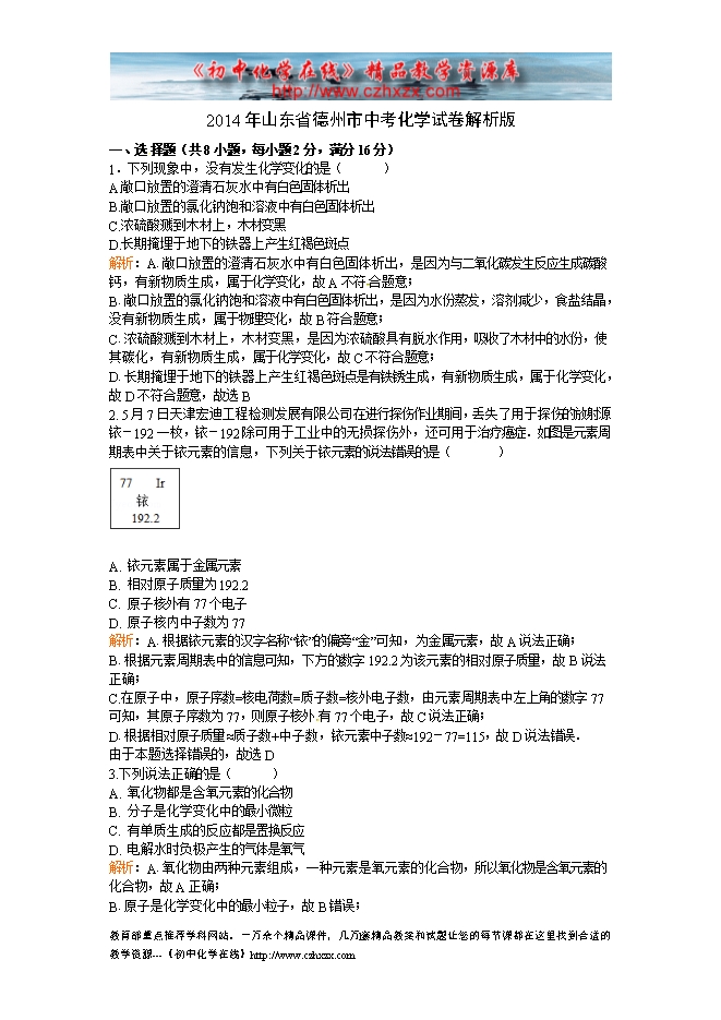 2014年山东省德州市中考化学试题及答案(word版,含解析)
