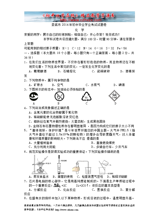2014年湖南省娄底市中考化学试题及答案(word版,含解析)