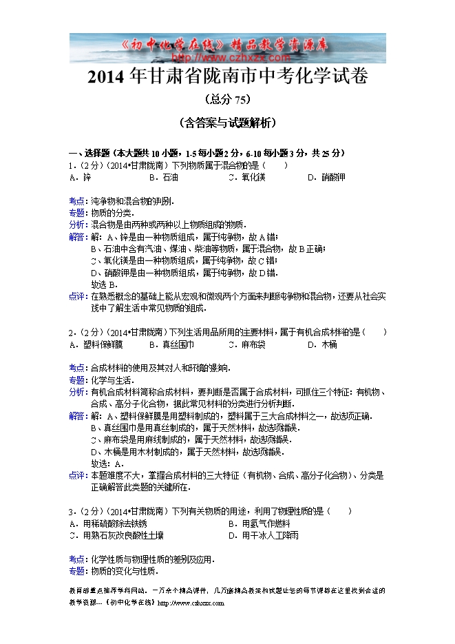 2014年甘肃省陇南市中考化学试题及答案(word版,含解析)