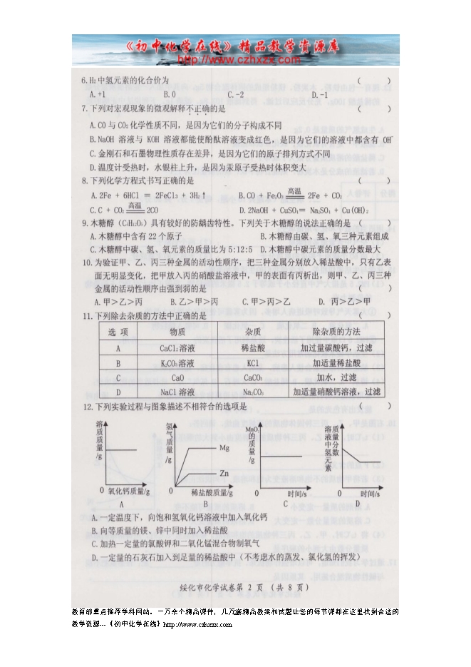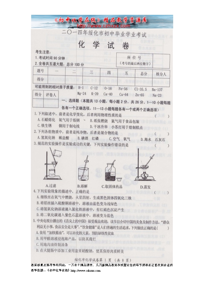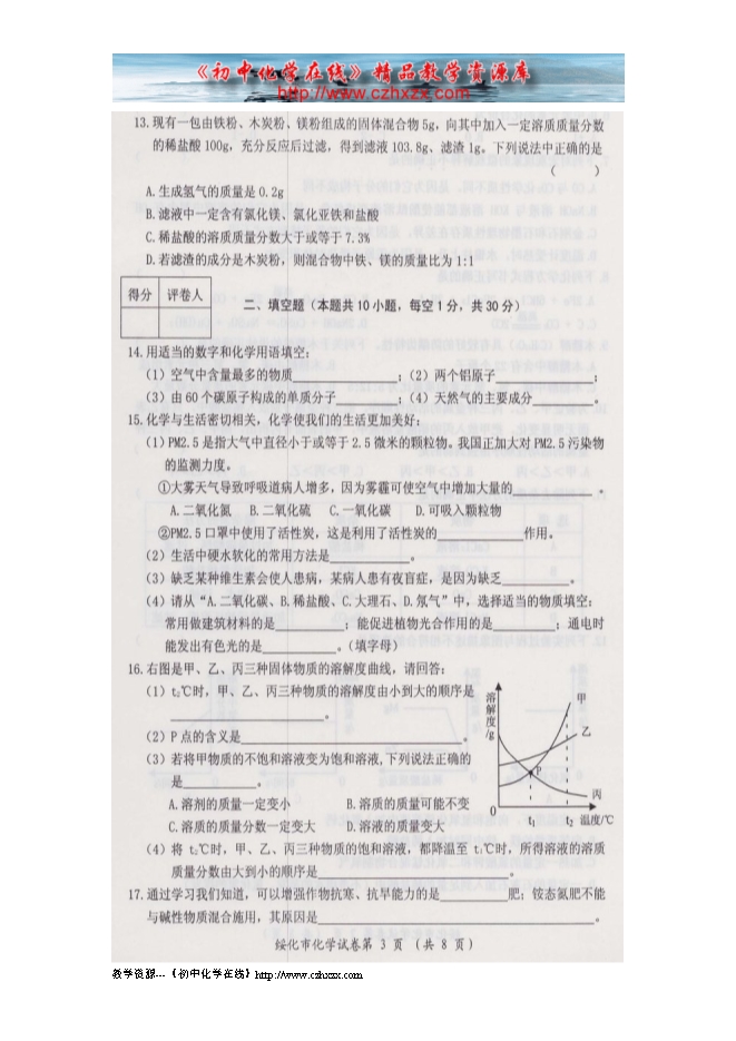 2014年黑龙江省绥化市中考化学试题及答案(扫描版)