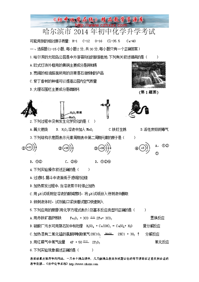 2014年黑龙江省哈尔滨市中考化学试题及答案(word版)