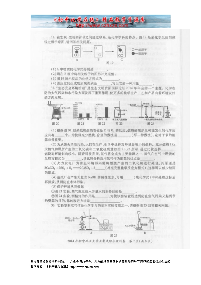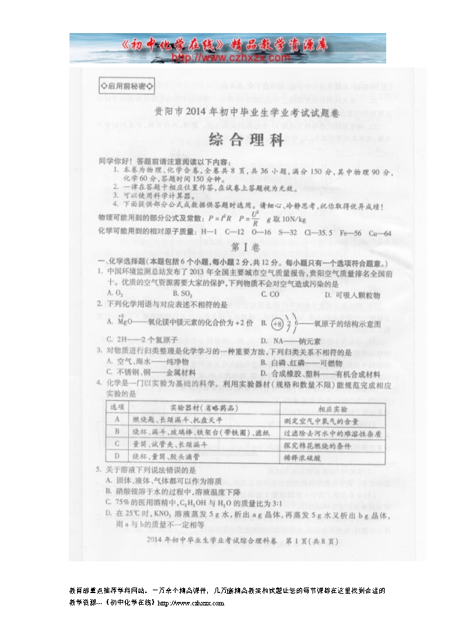 2014年贵州省贵阳市中考化学试题及答案(扫描版)
