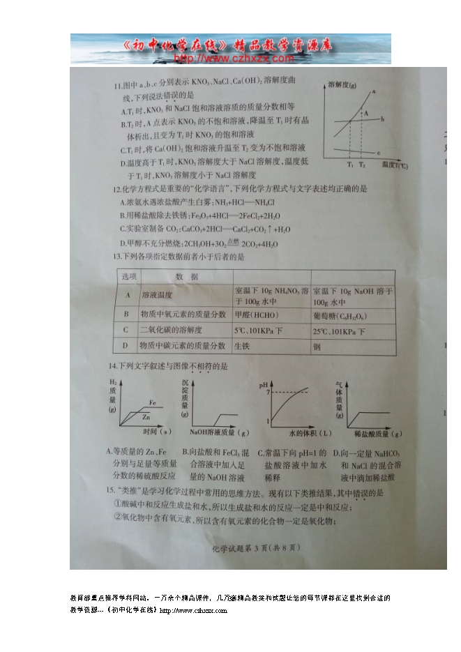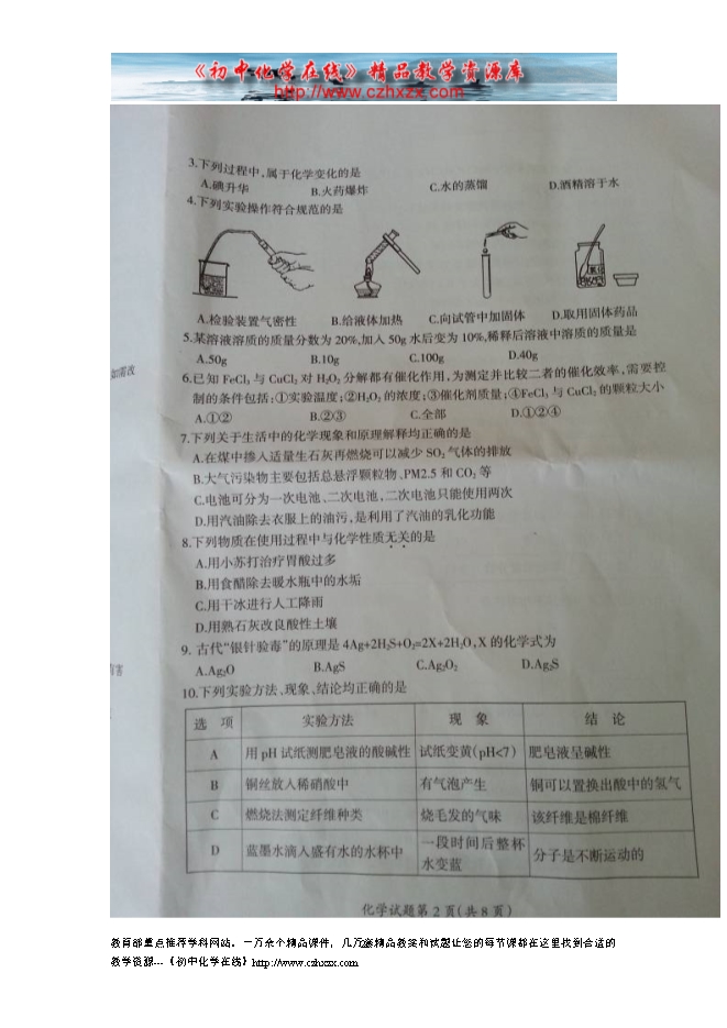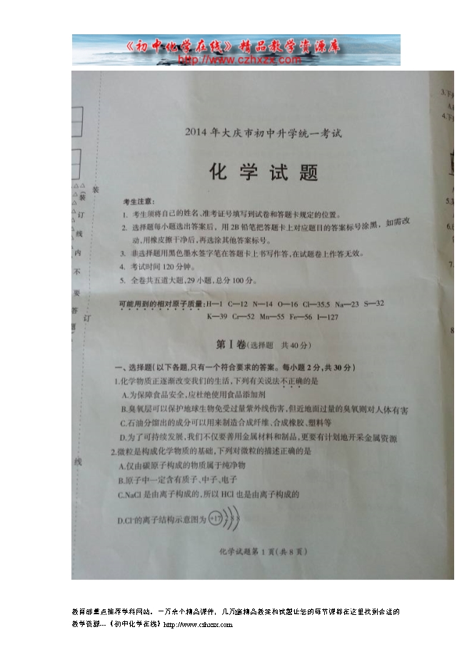 2014年黑龙江省大庆市中考化学试题及答案(扫描版)