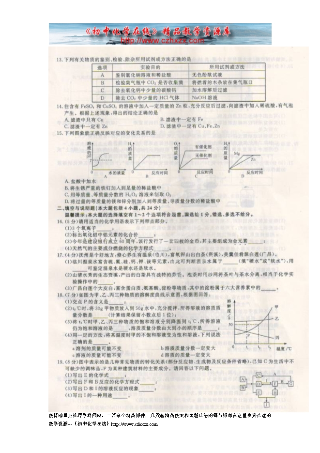2014年江西省抚顺市中考化学试题及答案(扫描版)