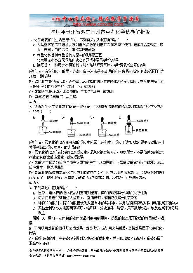 2014年贵州省黔东南州市中考化学试题及答案(word版.含解析)