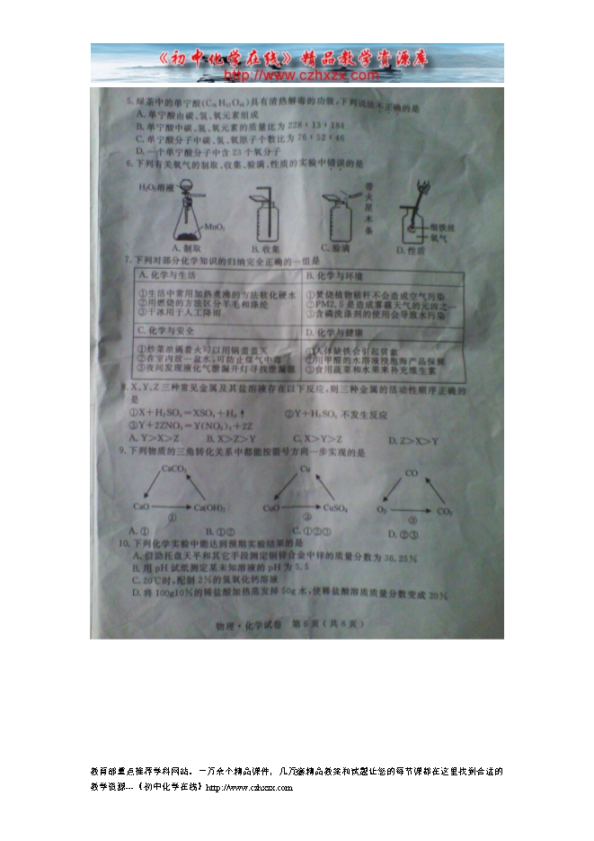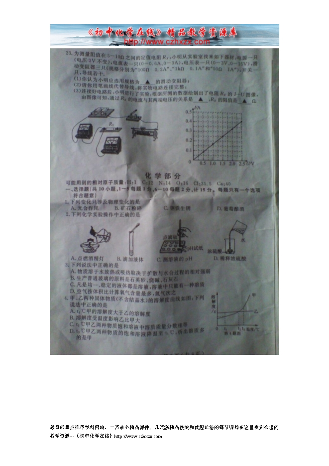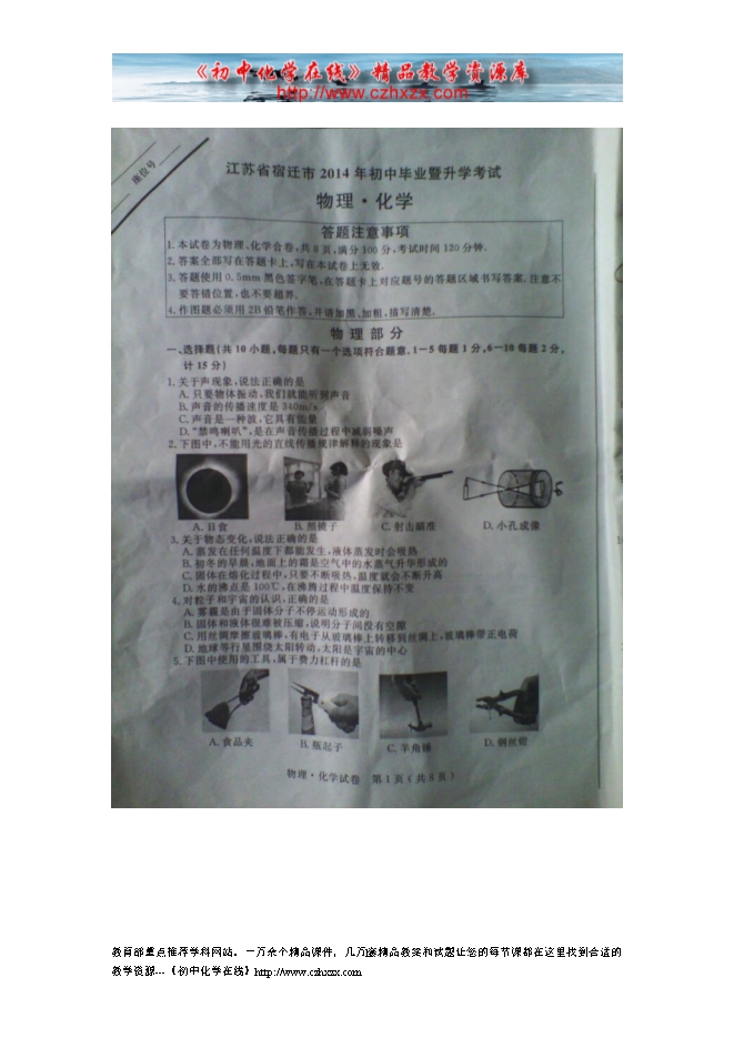2014年江苏省宿迁市中考化学试题及答案(扫描版)