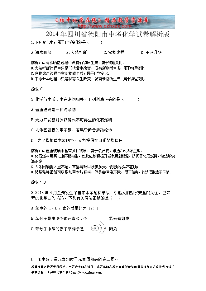 2014年四川省德阳市中考化学试题及答案(word版.含解析)