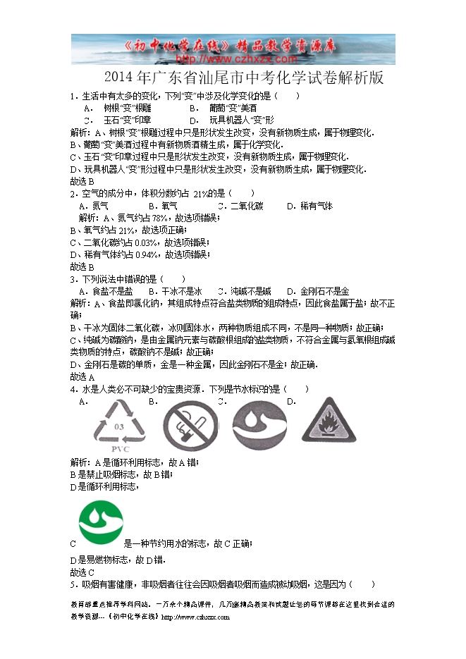 2014年广东省汕尾市中考化学试题及答案(word版.含解析)