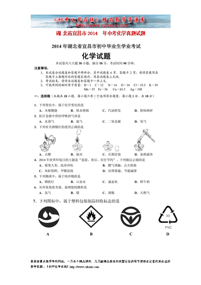 2014年湖北省宜昌市中考化学试题及答案(扫描版)