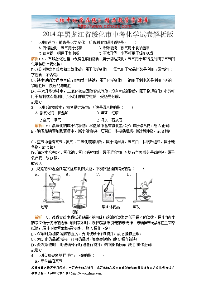 2014年黑龙江省绥化市中考化学试题及答案(word版.含解析)