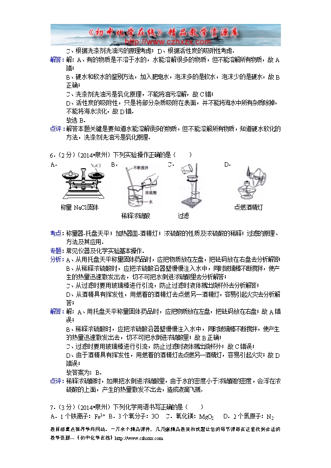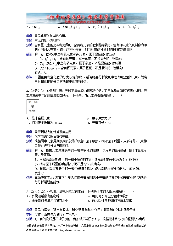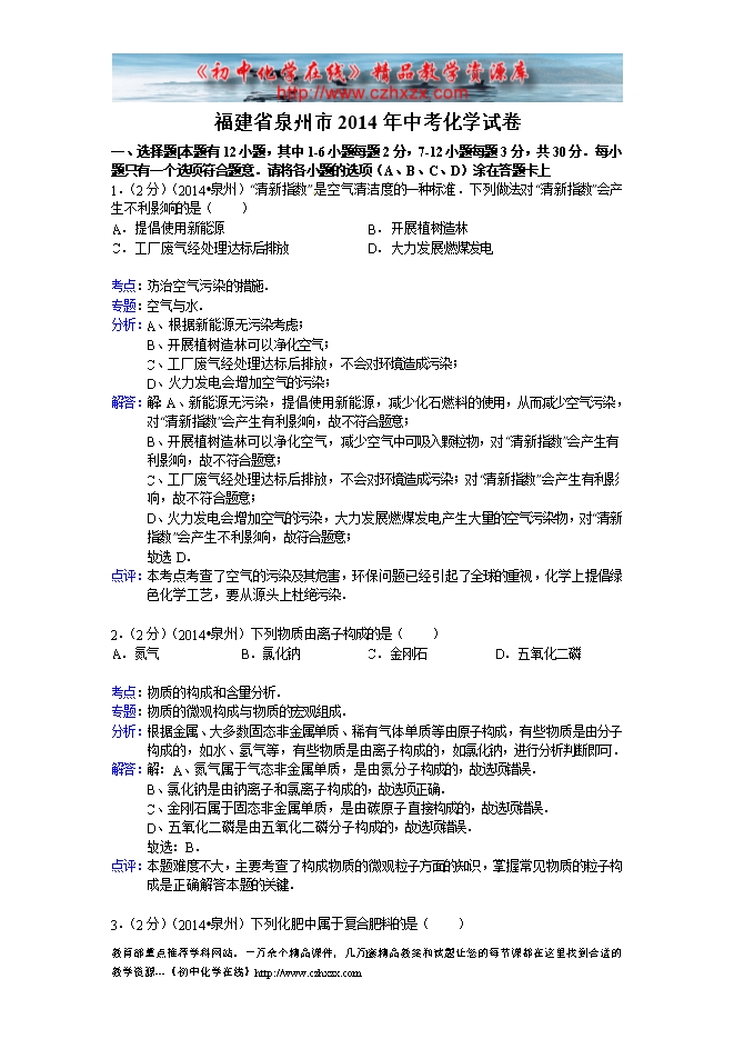 2014年福建省泉州市中考化学试题及答案(word版,含解析)