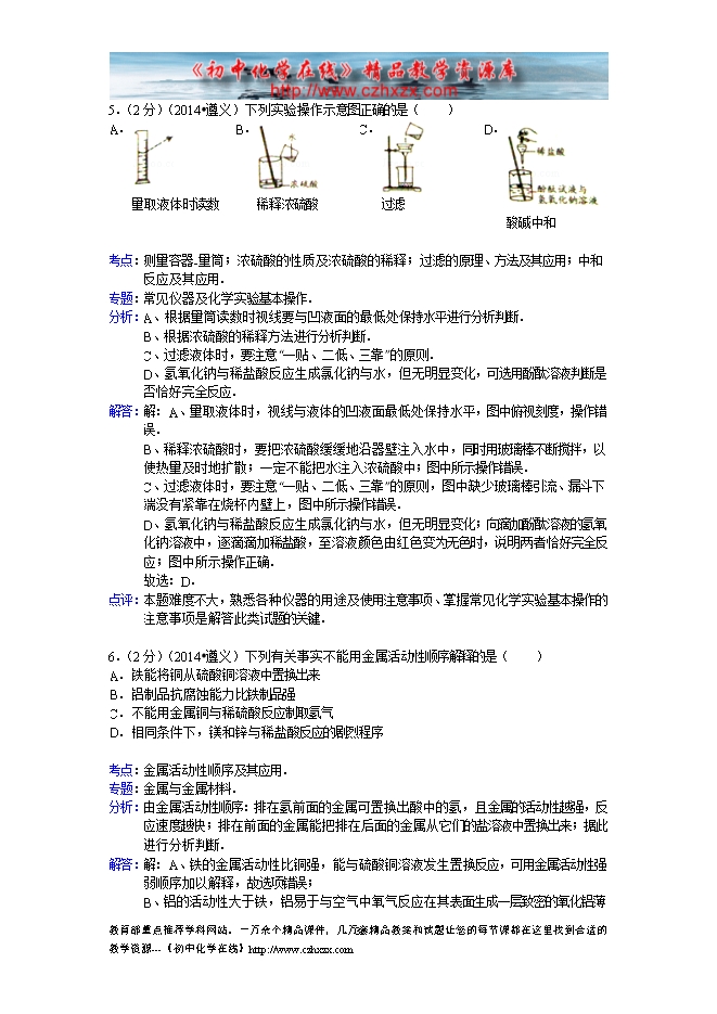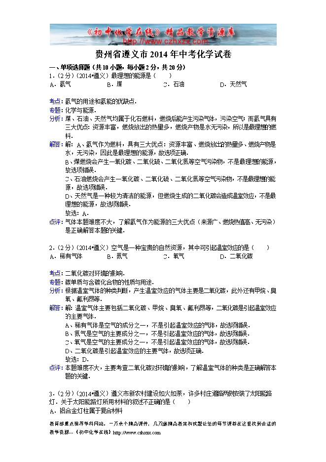 2014年贵州省遵义市中考化学试题及答案(word版,含解析)