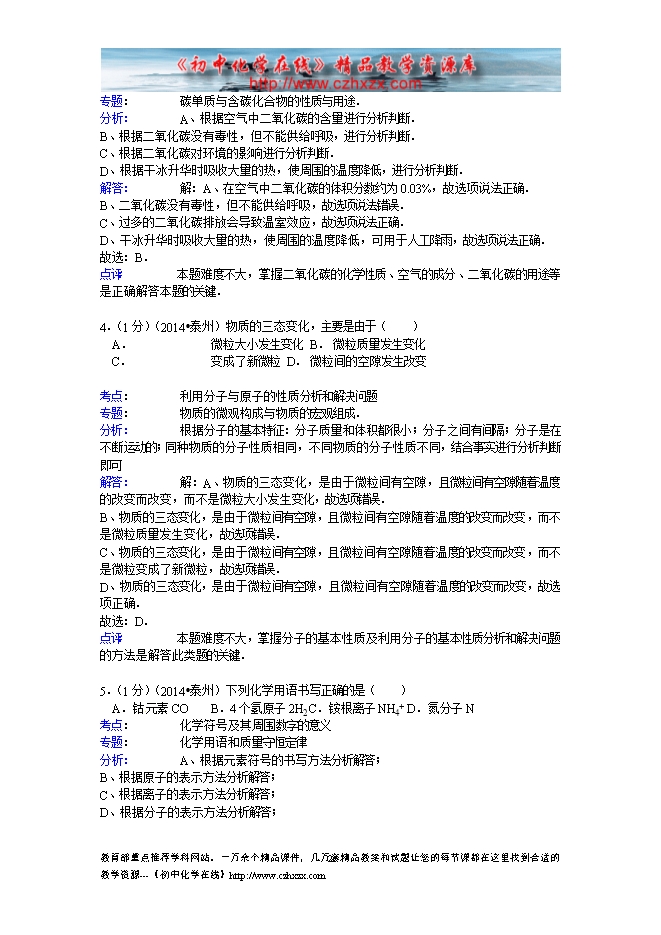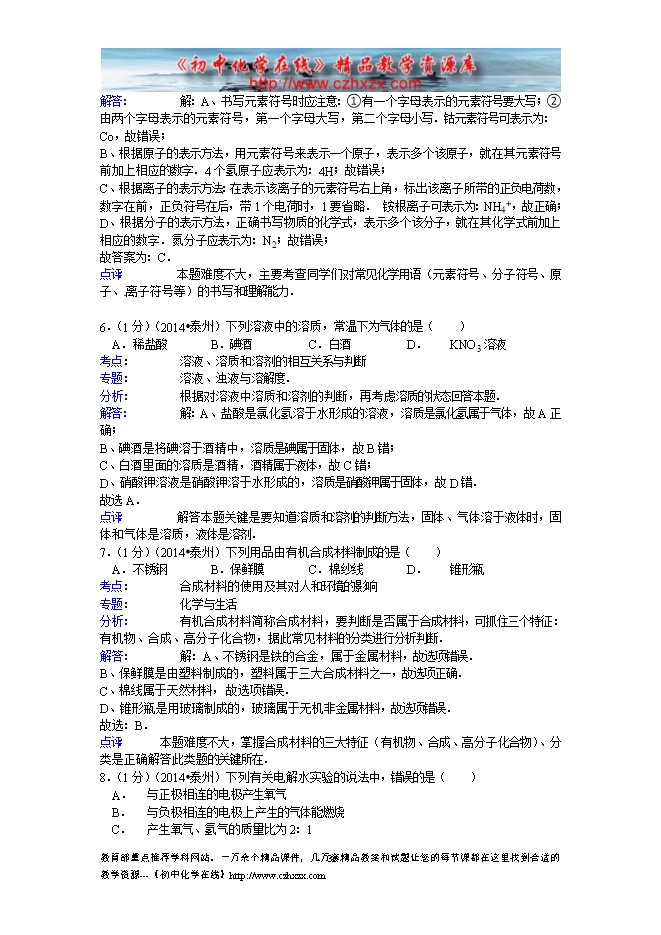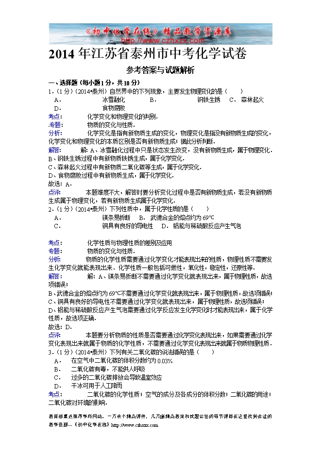 2014年江苏省泰州市中考化学试题及答案(word版,含解析)