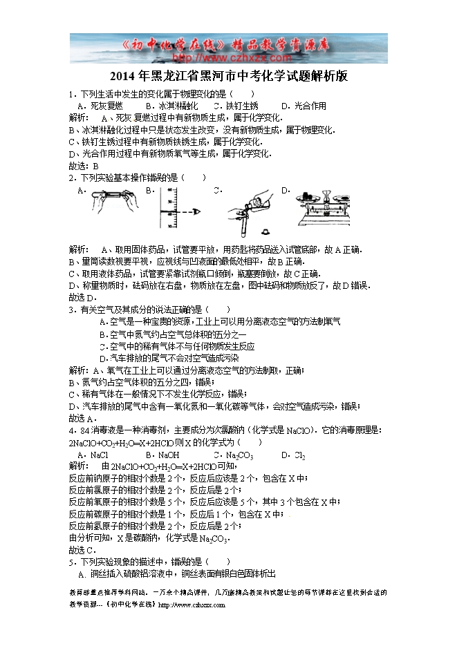 2014年黑龙江省黑河市中考化学试题及答案(word版,含解析)