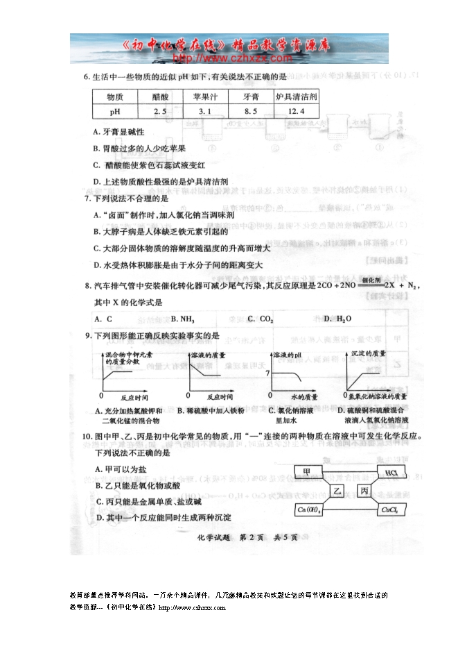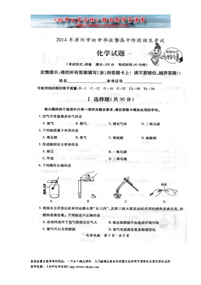 2014年福建省漳州市中考化学试题及答案(扫描版)