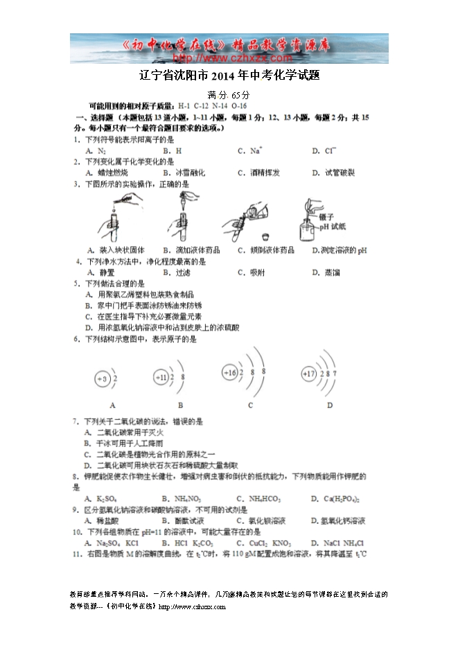 2014年辽宁省沈阳市中考化学试题及答案(扫描版)