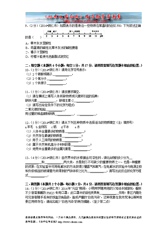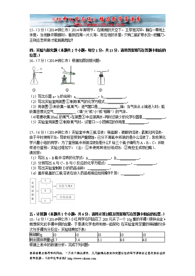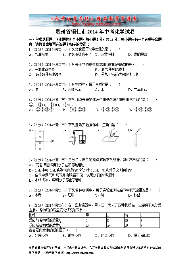 2014年贵州省铜仁市中考化学试题及答案(word版,含解析)