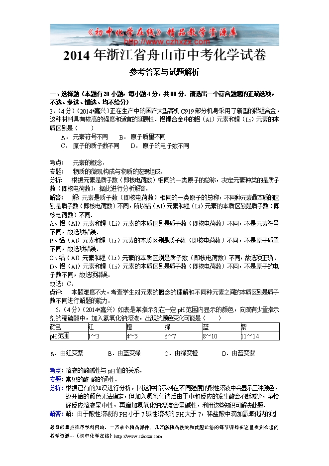2014年浙江省舟山市中考化学试题及答案(word版,含解析)