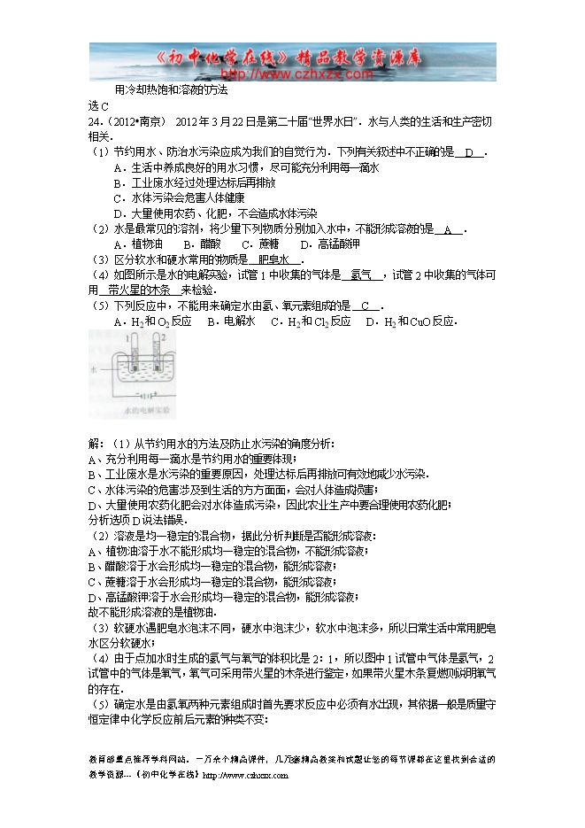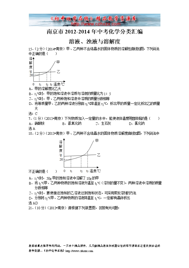 南京市2012-2014年中考化学分类汇编:6溶液浊液与溶解度