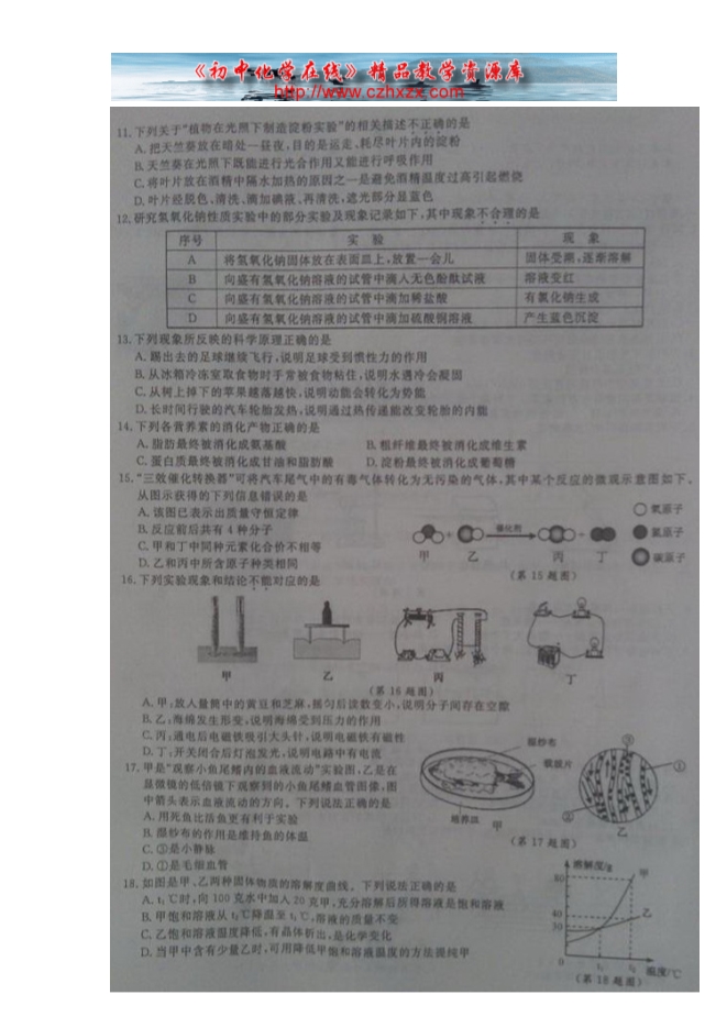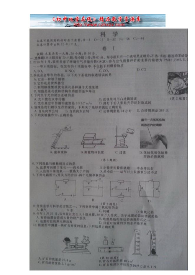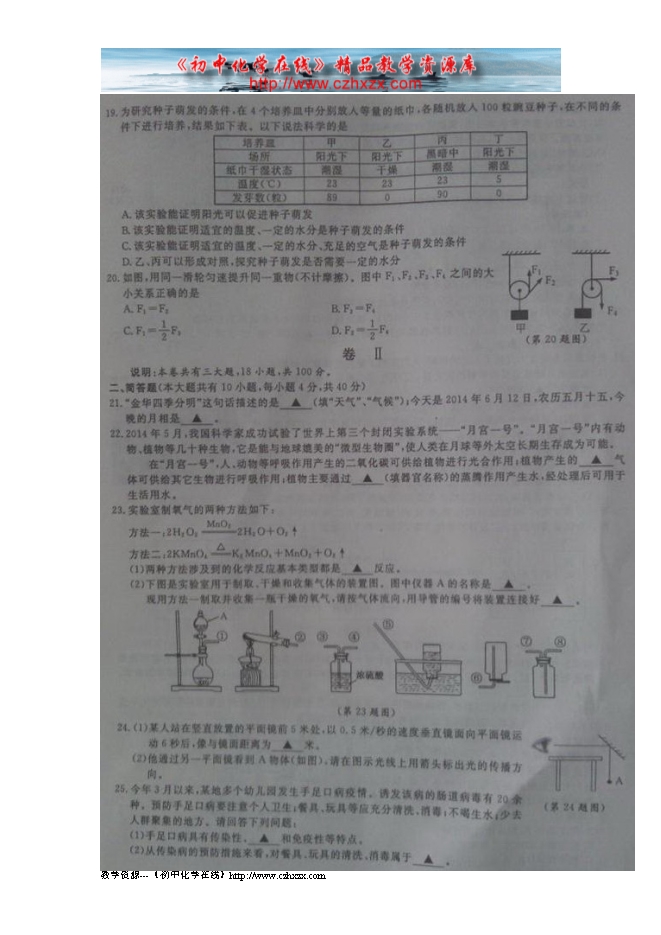 2014年浙江省金华市中考化学试题及答案(扫描版)
