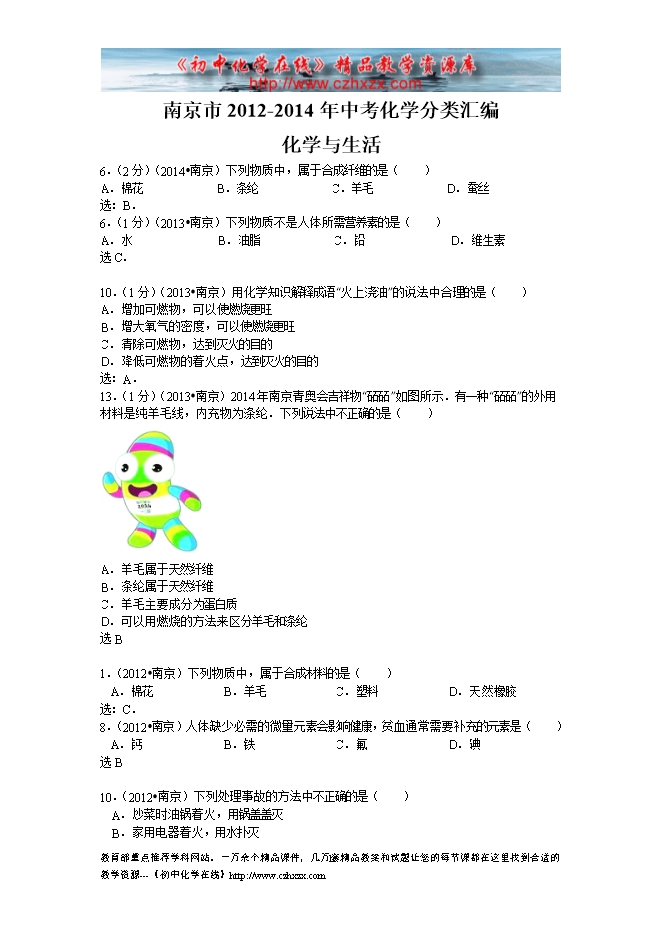 南京市2012-2014年中考化学分类汇编:16化学与生活