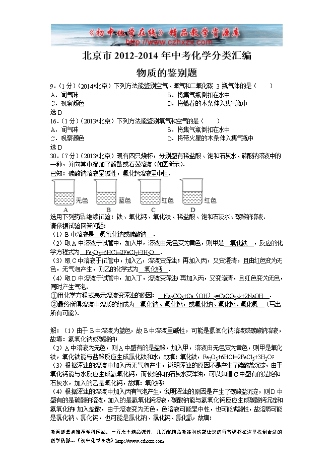 北京市2012-2014年中考化学分类汇编:4物质的鉴别题
