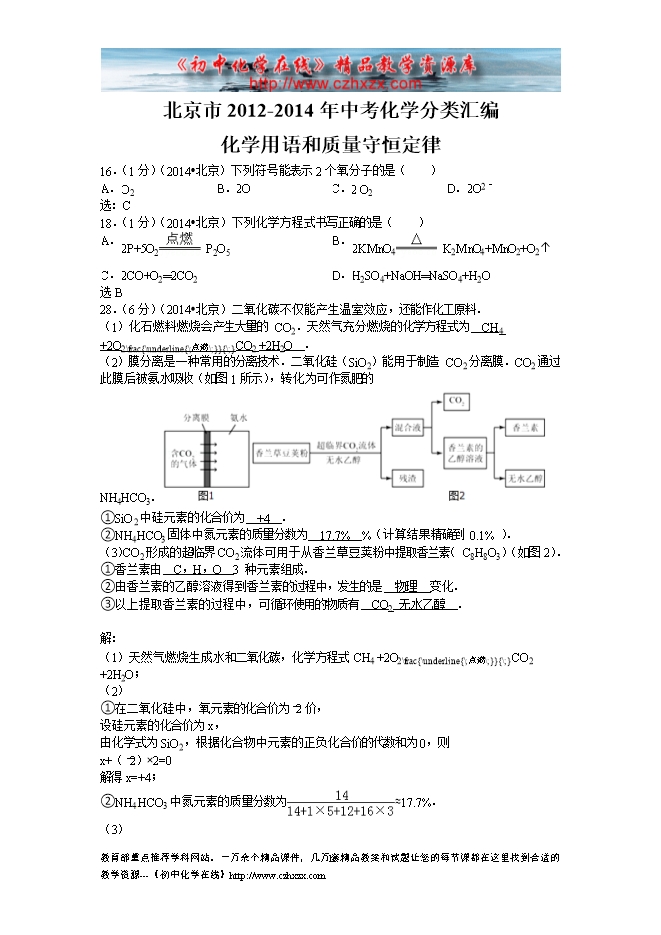 北京市2012-2014年中考化学分类汇编:6化学用语和质量守恒定律