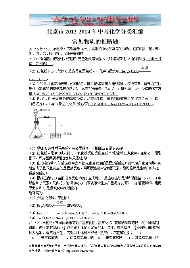 北京市2012-2014年中考化学分类汇编:8常见物质的推断题