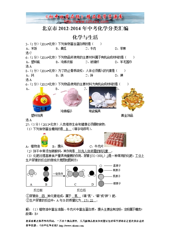 北京市2012-2014年中考化学分类汇编:17化学与生活