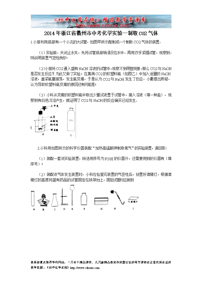 2014年浙江省衢州市中考化学实验—制取CO2气体