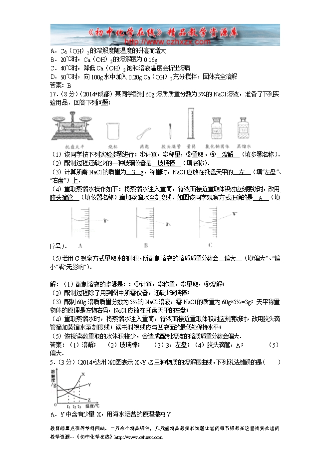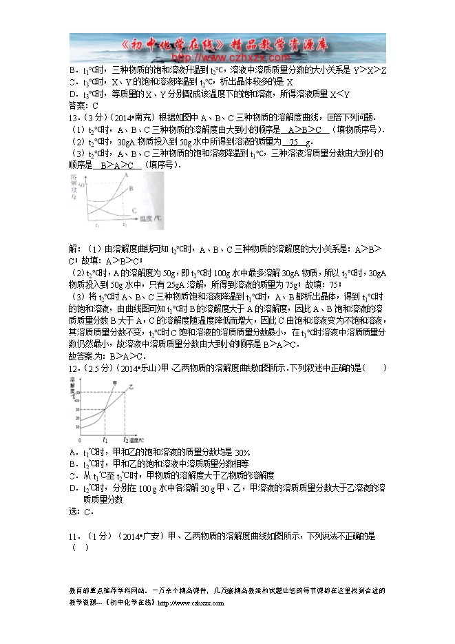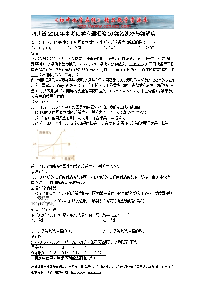 四川省2014年中考化学专题汇编:10溶液浊液与溶解度