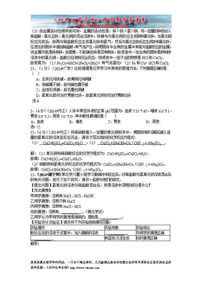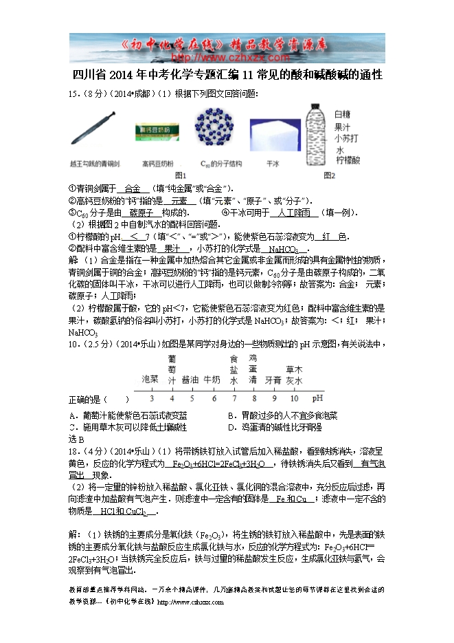 四川省2014年中考化学专题汇编:11常见的酸和碱酸碱的通性