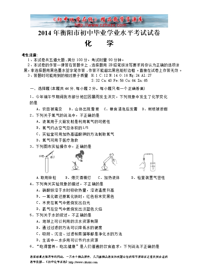 2014年湖南省衡阳市中考化学试题及答案(word版)
