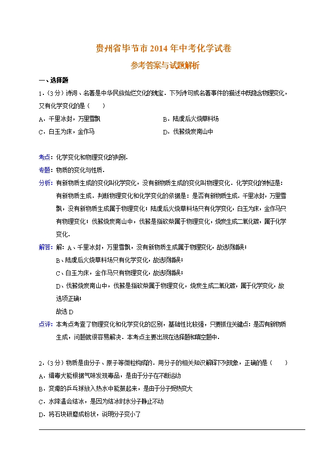 2014年贵州省毕节市中考化学试题及答案(word版,含解析)